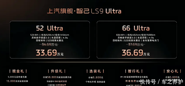 智己LS9目前推出了52 Ultra与66 Ultra两款车型,两车差价3万元,主要体现在电池容量与续航上。52 Ultra的CLTC纯电续航为320km,综合续航1454km,66 Ultra的CLTC纯电续航达402km,综合续航1508km。从配置上看,两款车型都相当丰富,800V架构、激光雷达、英伟达Thor芯片、B&O音响、主驾及二排右座4D机械按摩、全车三把零重力座椅等亮点配置,两款车均有配备。